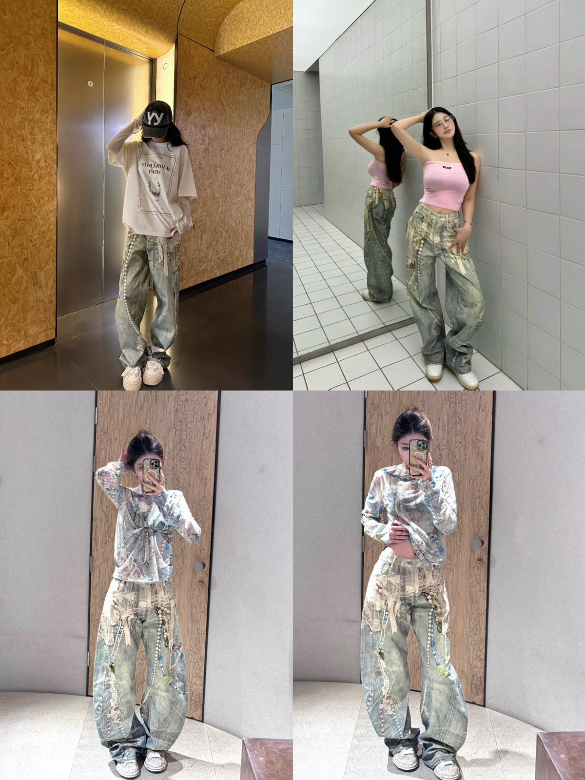 Acne Studios ss25新款1981蕾絲珍珠印花彎刀牛仔褲