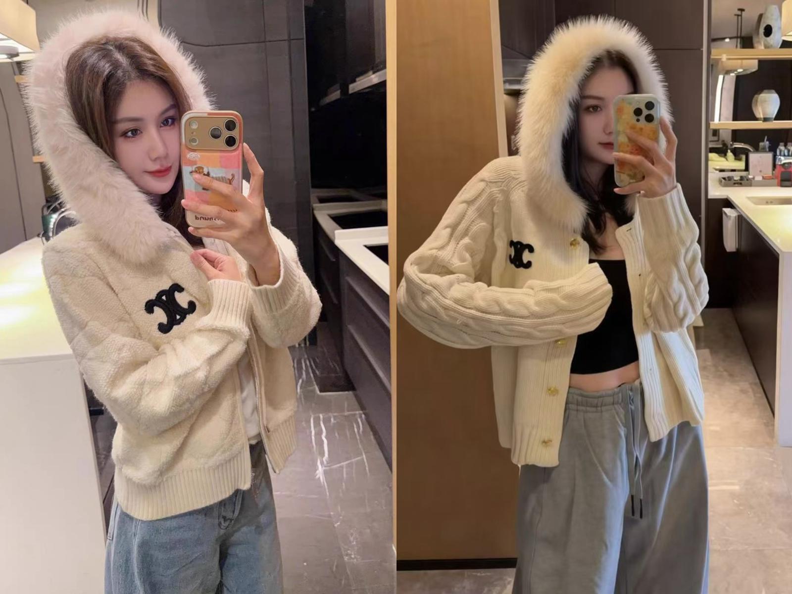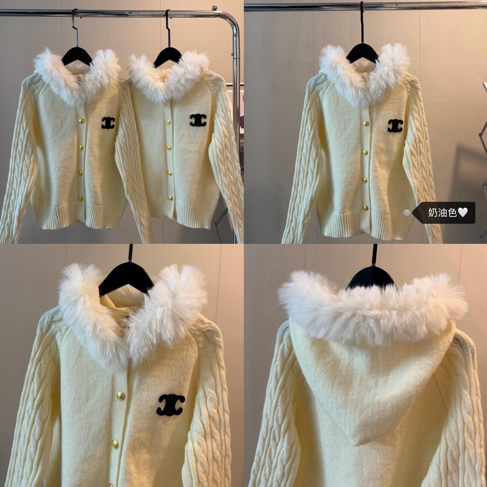 Celine新款毛領刺繡拉鍊針織毛衣短款外套
